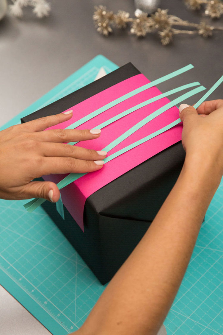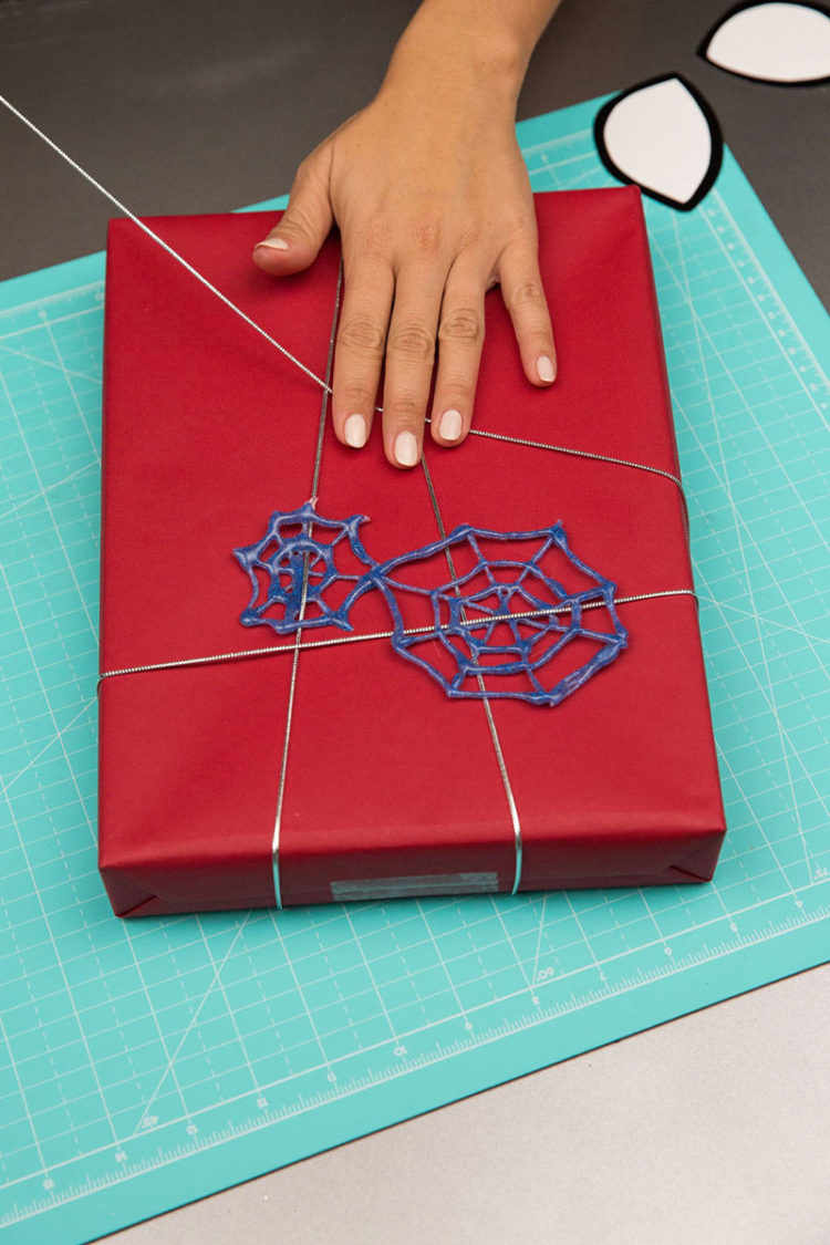 Tape one finish of the silver string to the again of the present field. Wrap the string across the field to create an internet. Thread the blue glitter webs onto the silver string earlier than attaching the opposite finish.