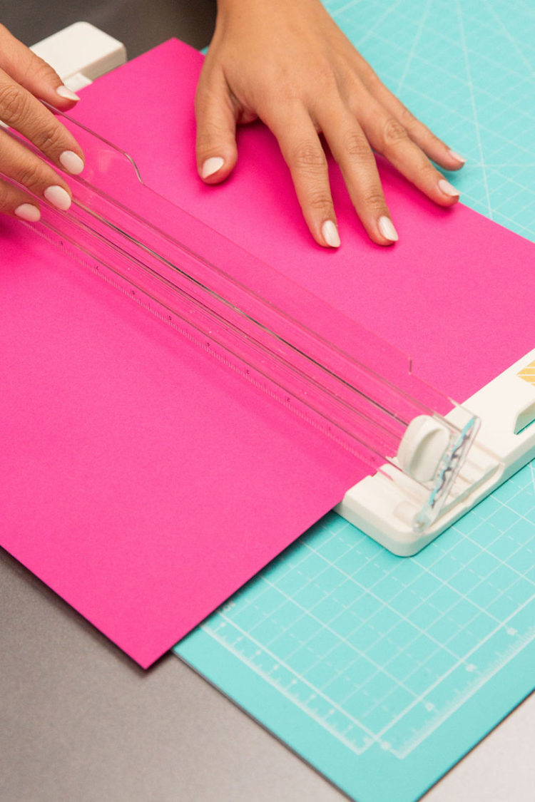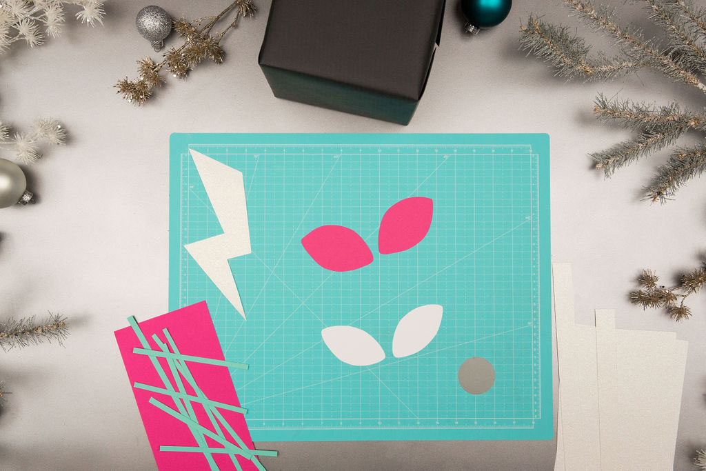 Cut out Gwen Stacy’s eyes from pink cardstock and white glitter cardstock. Layer the white eye form onto the pink form. Attach by rolling a chunk of tape for every eye.