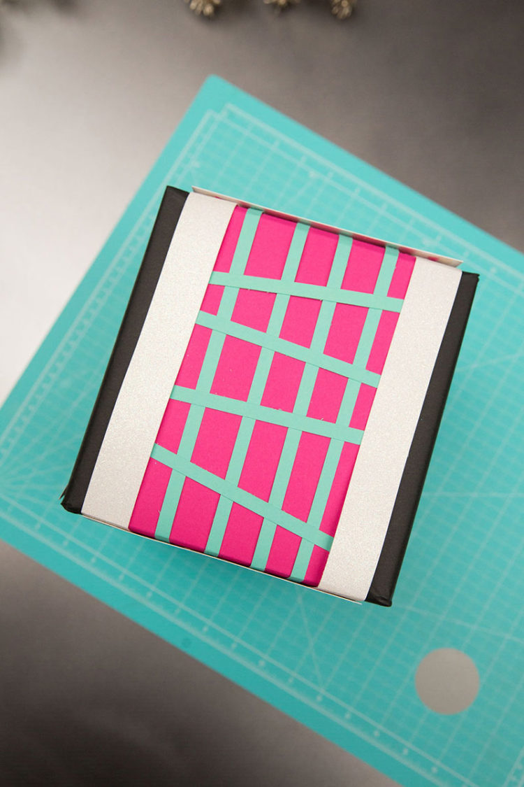 Cover the remaining sides of the field with white glitter cardstock. Add two strips of white glitter cardstock alongside the edges of the pink and aqua part. Attach all with tape.