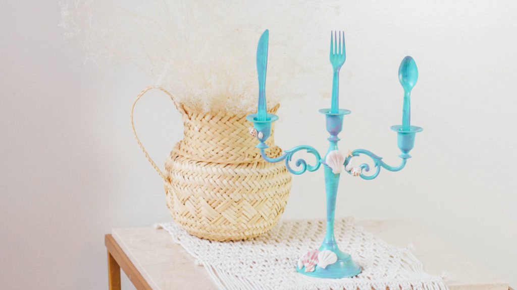 Attach a couple of shells across the candelabra with sizzling glue.